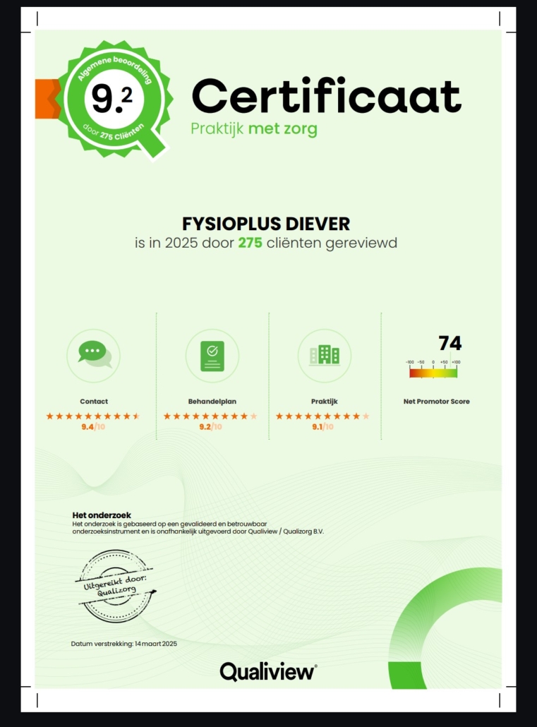Via Qualiview krijgt iedere patiënt de mogelijkheid om zijn of haar ervaring te delen. Deze vragenlijst geeft inzicht in hoe de fysiotherapeutische behandeling is verlopen. We waarderen het enorm als u deze blijft invullen. Zo kunnen wij blijven leren, verbeteren en onze zorg steeds verder optimaliseren.