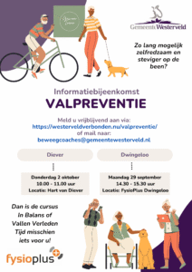 Dit kan via https://westerveldverbonden.nu/valpreventie/ of per e-mail naar [email protected], of telefonisch via 14-0521. Geef daarbij door welke bijeenkomst u wilt bijwonen.